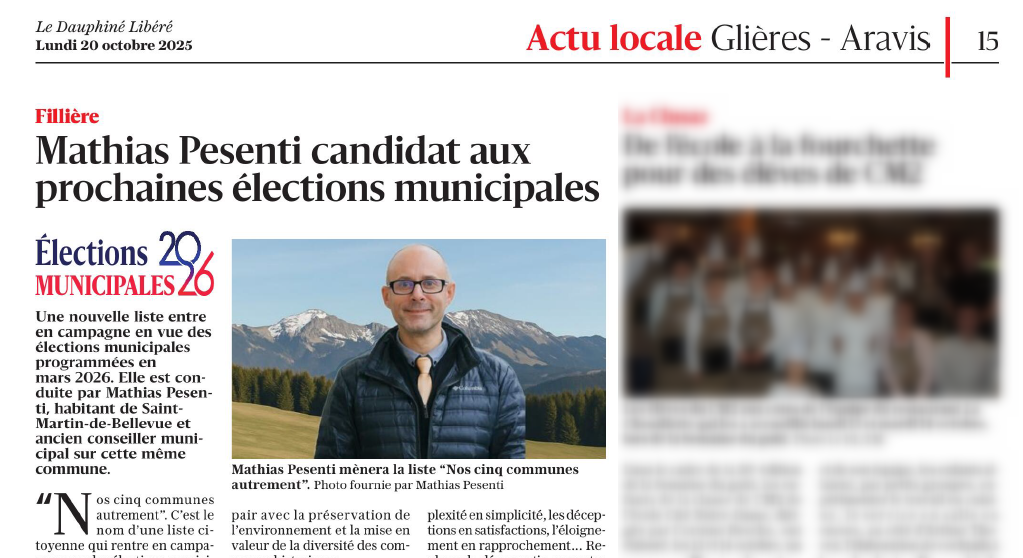 Avec la liste sans étiquette « Nos 5 communes autrement », je veux répondre aux enjeux de transparence, de performance et de proximité face aux mutations légales et sociales de la commune.